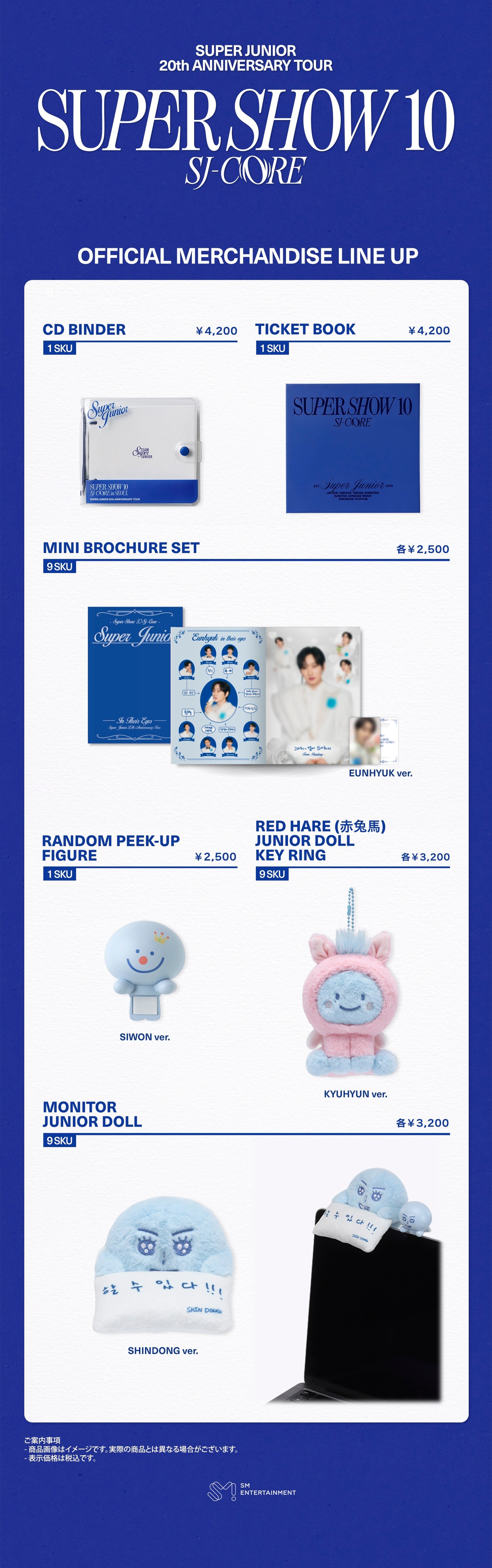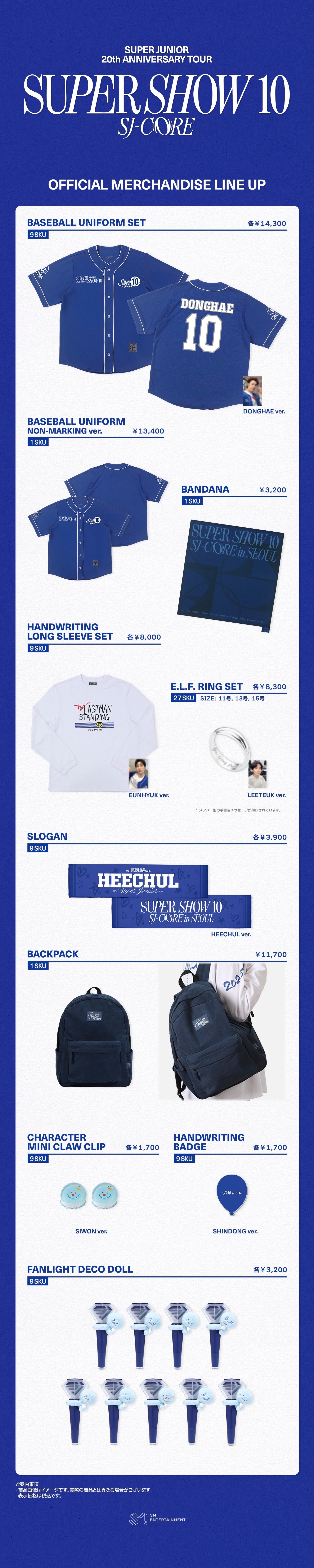 SUPER JUNIORらしいパールサファイアブルーのカラーが目を惹くBASEBALL UNIFORM SETや、FANLIGHT DECO DOLLをはじめとしたキャラクターアイテムなど様々なラインナップをご用意いたしました!